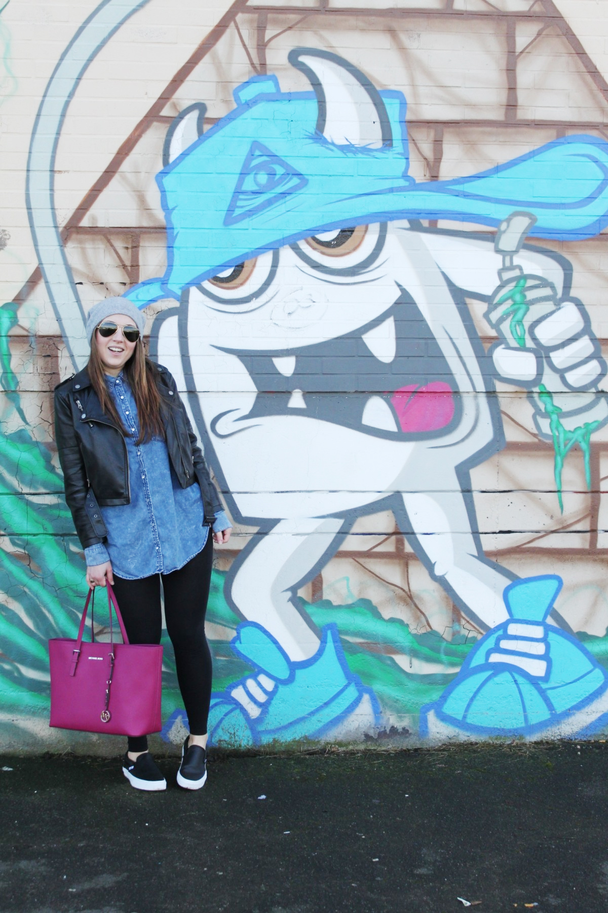Da läuft man so durch seine Stadt und überlegt wo man gute Outfitfotos machen könnte. Kurz vor Sonnenuntergang laufe ich über den Messeplatz und denke so: Oh, Kunst! Das ist perfekt um Outfitfotos zu machen. Kamera ausgepackt und in Pose geworfen. Die Kunstwerke an der Wand hinter mir, sind die Werke eines lokalen Künstlers namens Carl Kenz (& Künstlerkollegen). Ich habe ihn letztes Jahr auf einer Veranstaltung getroffen und muss sagen, dass er wirklich ein cooler und kreativer Typ ist.